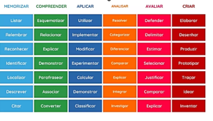 Uma das formas de percepção da progressão da aprendizagem pode ser por meio de verbos, presentes na escrita das habilidades, expressando a capacidade nos níveis cognitivo, afetivo e motor, conforme a taxonomia dos objetivos educacionais de Bloom, uma estrutura em níveis de complexidade crescente. Observe abaixo os níveis do domínio cognitivo e reflita sobre a habilidade que será trabalhada, compreenda em qual nível cognitivo a habilidade se encontra, com base no quadro citado abaixo.